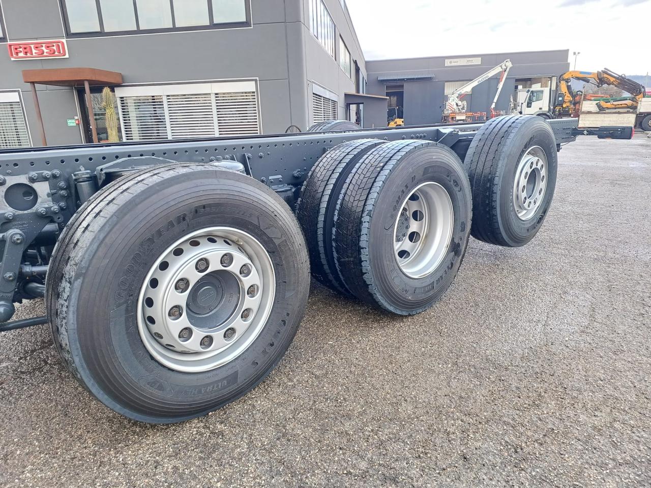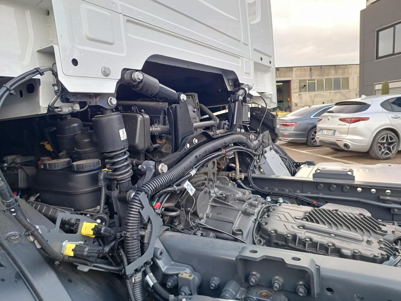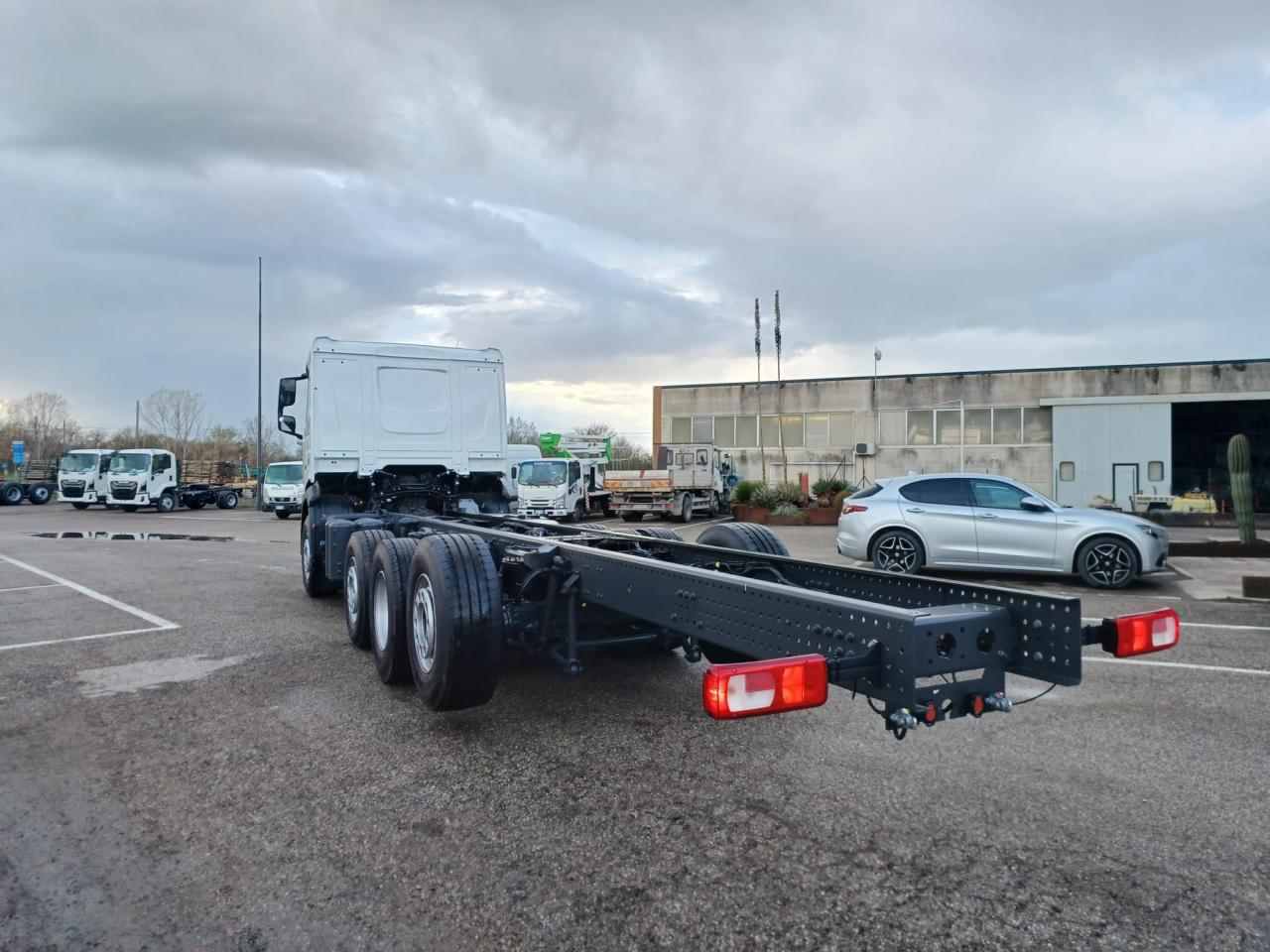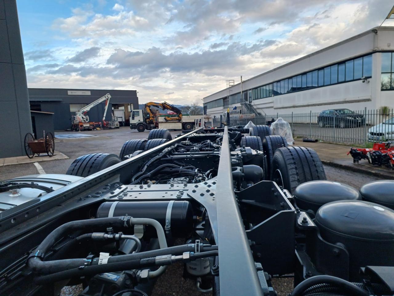 Veicolo NUOVO in pronta consegna, E6, cilindrata 13000 cc, cv 483, kw 355, 6 cilindri multicoppia, cambio automatico TraXon 12 marce, passo 5.05 mt, sbalzo posteriore 3,20 mt, assale anteriore 9.00 t a paraboliche, assale posteriore 28 t con sospensioni pneumatiche, rapporto al ponte assale posteriore 2.47, serbatoio carburante da 340 litri, massa totale a terra relativa a peso telaio 36000 kg, massa massima relativa a barra di traino/giunto 56000 kg, aletta parasole esterna, fari ledi, aria condizionata, 2 posti in cabina, volante multifunzione, fendinebbia anteriori e posteriori, predisposizione presa di forza, sedile del conducente con sospensione pneumatica, sedile del conducente con braccioli regolabili su entrambi i lati, cruise control adattivo, norme di sicurezza ADR per classi AT+ FL+ EXII/III che include interruttore di isolamento della batteria sul telaio che può essere controllato in cabina, freno motore MX, scudo contro il sollevamento della polvere.